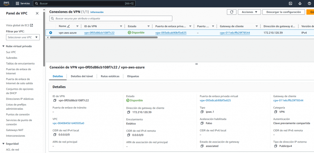 En AWS veríamos el Túnel 1 levantado. (Notar que el Túnel 2 no lo hemos configurado)